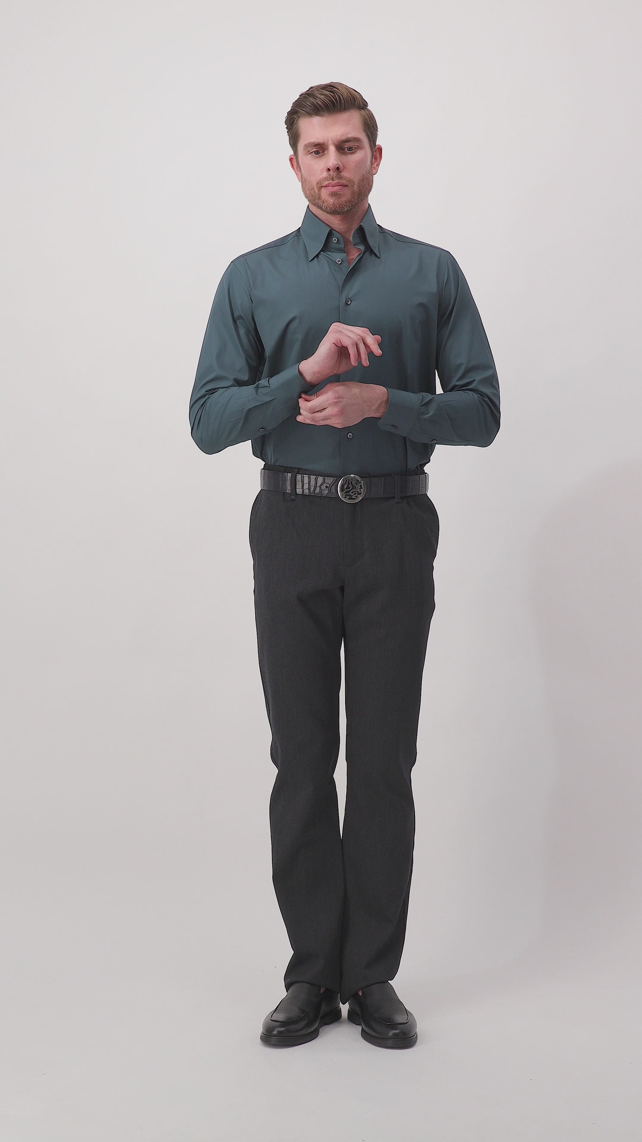 هذا القميص القطني الرسمي مزين بتطريز ثلاثي على الياقة وأساور الأكمام مما يضفي لمسة من الرقي. ارتديه مع جاكيت جلدي وبنطلون جينز لإطلالة كاجوال أنيقة أو ارتديه مع سترة بلايزر لإطلالة أكثر رسمية.