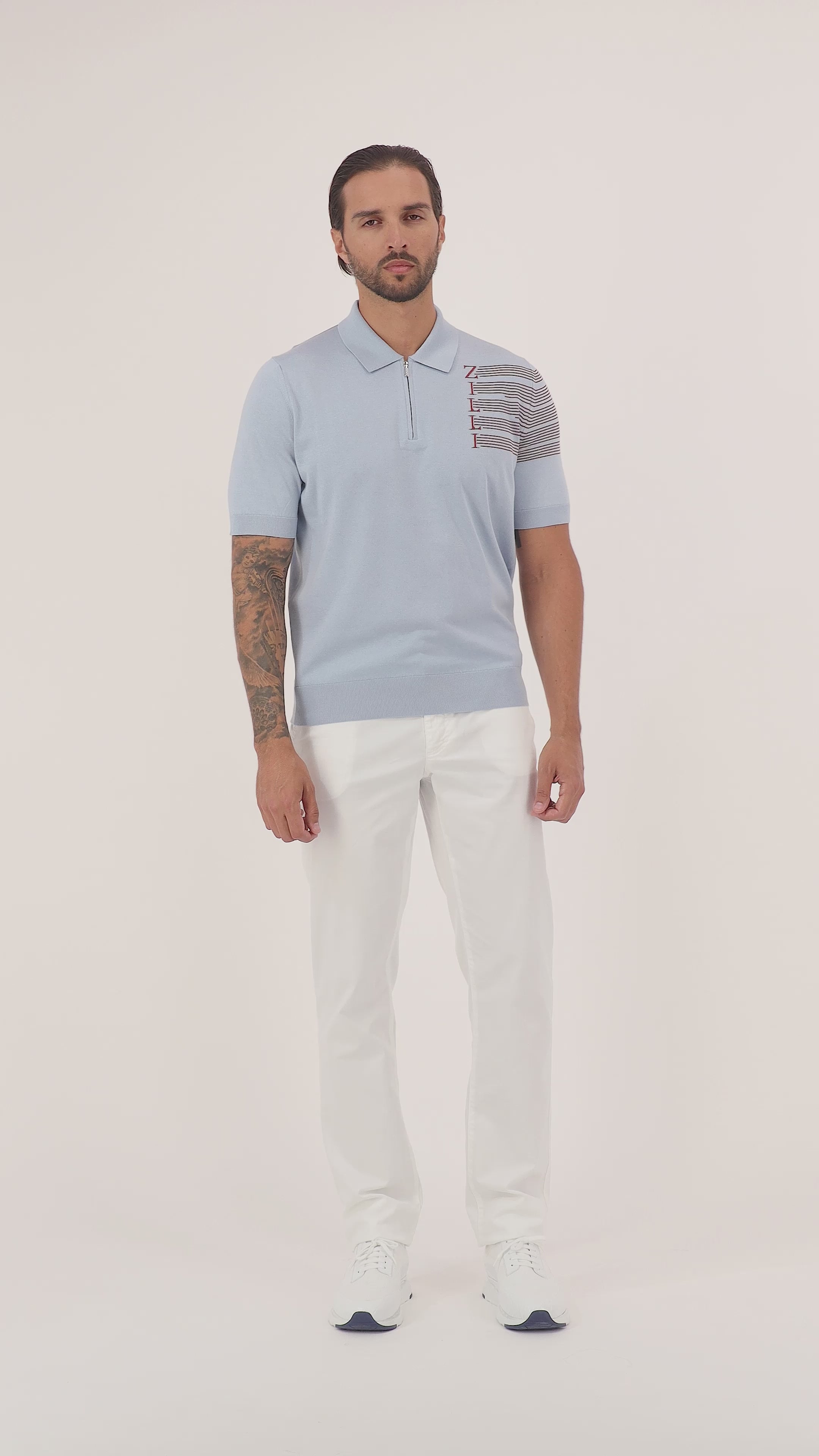 يجمع هذا البولو ذو الأكمام القصيرة بين القطن والحرير لإضفاء ملمس فاخر، ويتميز بإغلاق بسحاب مميز. تضيف حروف Zilli العمودية المنسوجة بنمط الجاكار من الكتف إلى الصدر لمسة فريدة من نوعها. يتناسب تصميمه الأنيق مع الملابس الكاجوال والأنيقة على حد سواء.