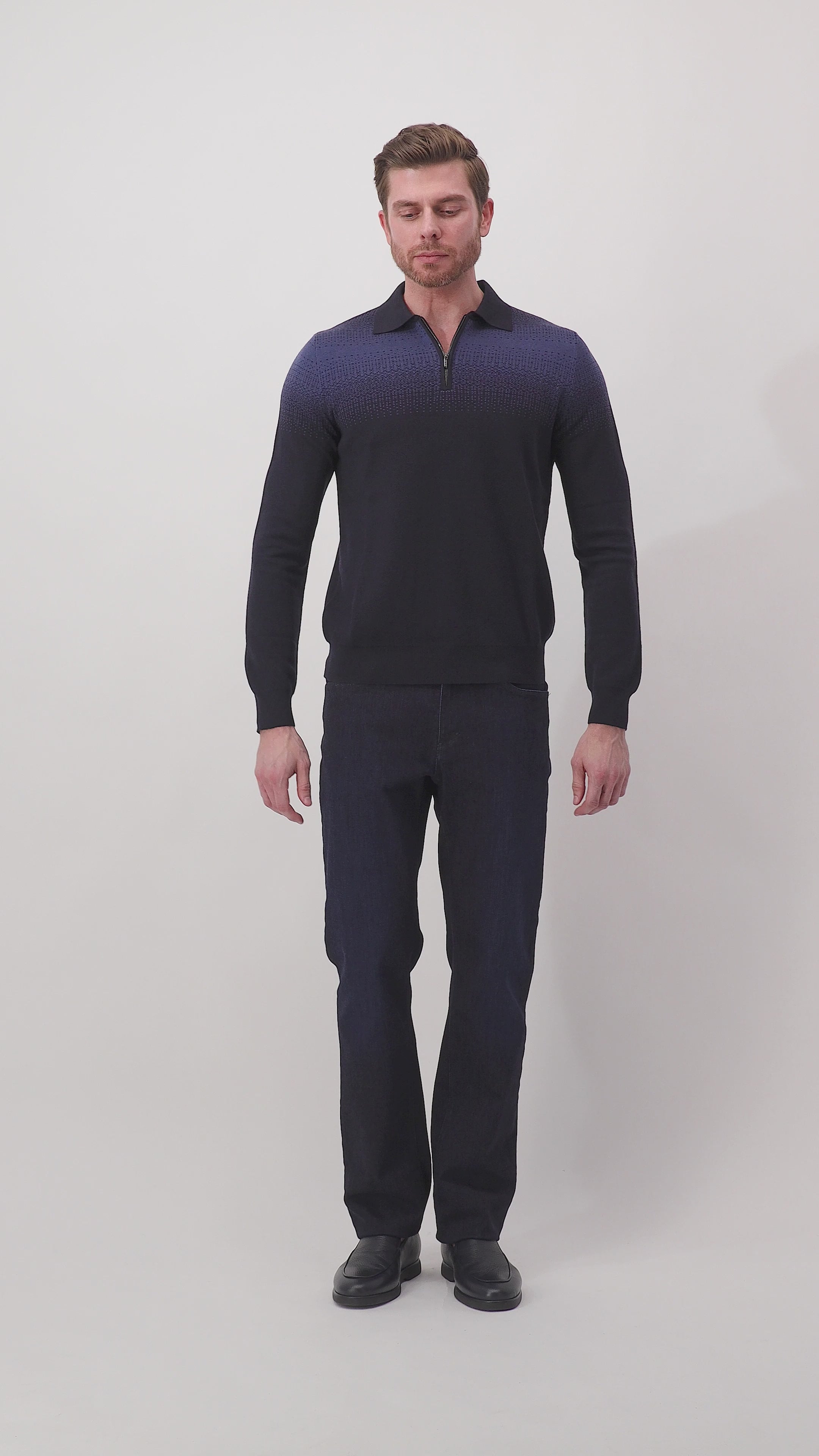 Эта рубашка-поло на молнии, созданная из роскошной смеси шерсти и шелка, украшена жаккардовым переплетением "Shading" в синих тонах, создающим интенсивный и завораживающий визуальный эффект. Современный дизайн дополнен воротником на молнии, украшенным биркой ZILLI из латуни с рутениевым покрытием. Универсальное и изысканное, это поло легко сочетается с шерстяными брюками для утонченного образа или с джинсами для более повседневного, но элегантного стиля.