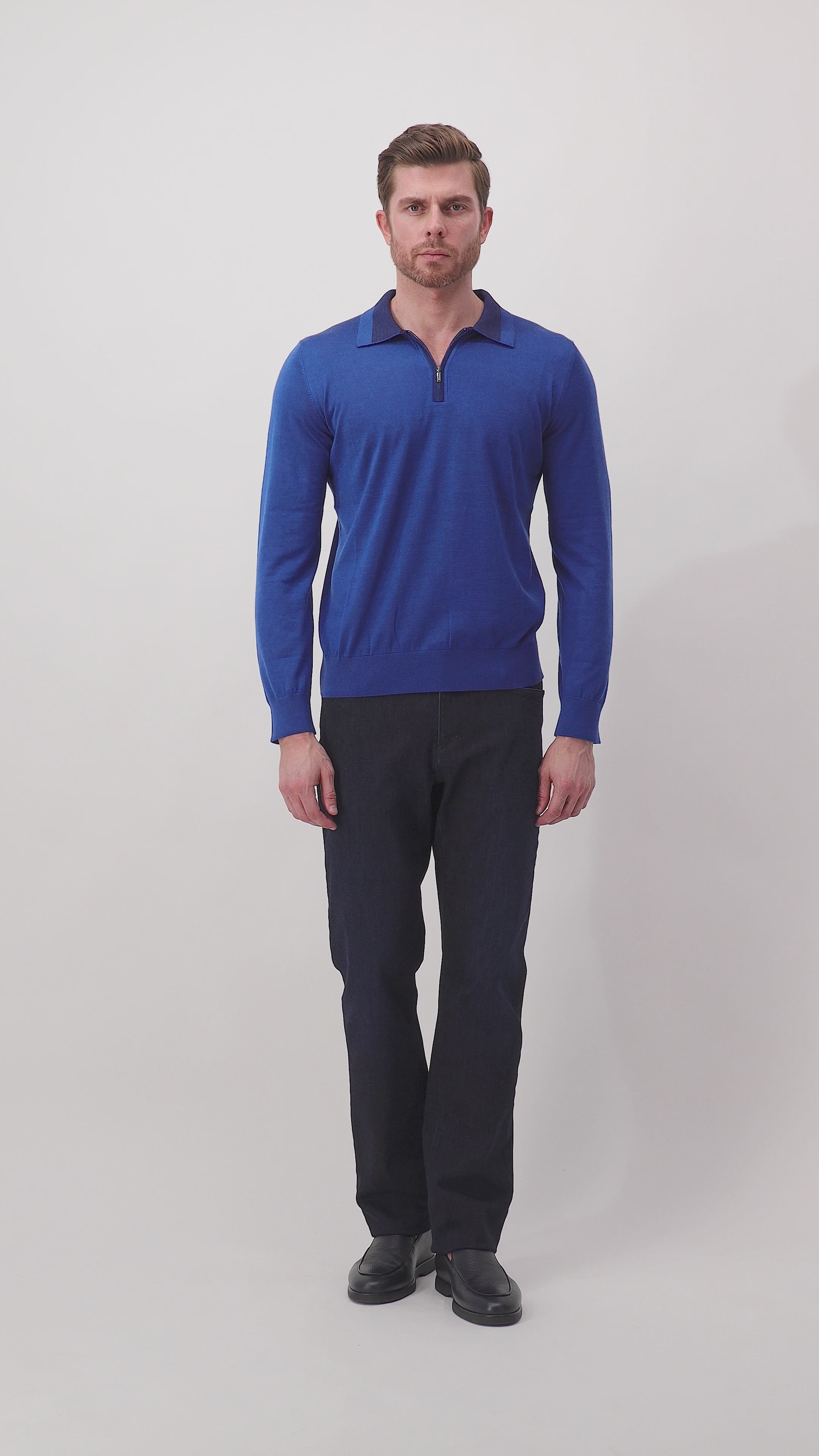 Ярко-синийЭта изысканная ярко-синяя рубашка-поло на молнии изготовлена из роскошной смеси шерсти и шелка, что обеспечивает как комфорт, так и стиль. Дизайн отличается классической застежкой-молнией и ребристыми деталями на воротнике, манжетах и подоле, что обеспечивает шикарный силуэт. Идеально подходит для сочетания с джинсами и мокасинами для создания элегантного повседневного образа.